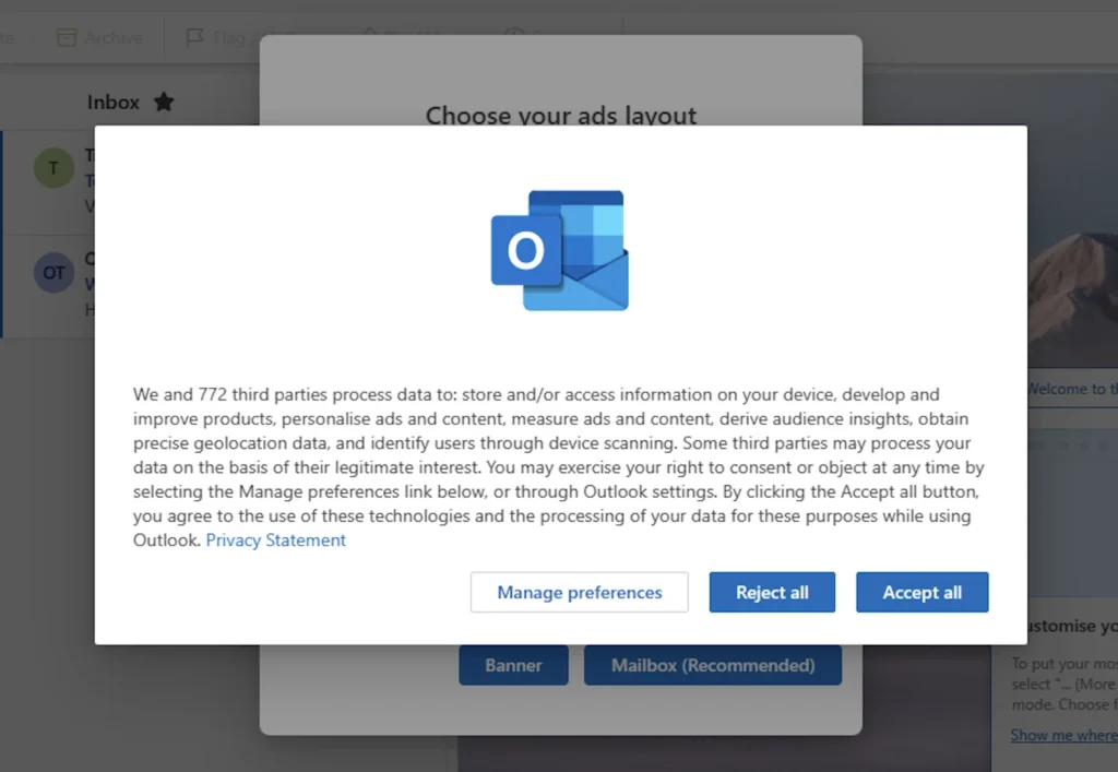 Proton explique aussi qu’en Grande Bretagne, le nouvel Outlook propose même à l’utilisateur la possibilité d’accepter ou de refuser individuellement le partage avec chaque partenaire publicitaire (je serais curieux de savoir combien de personnes ont passé du temps à lire chacune des conditions d’utilisations des différents partenaires)